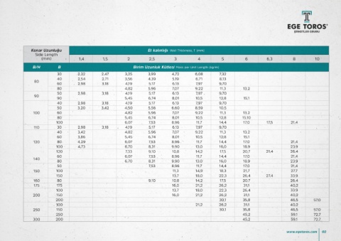 Kenar Uzunluğu Et kalınlığı Wall Thickness, T (mm) Kenar Uzunluğu Et kalınlığı Wall Thickness, T (mm)
